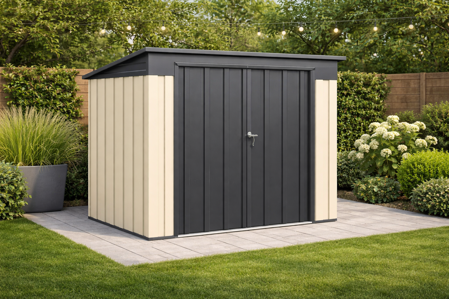 Color: Beige / Dark Gray Weight: 92 KG Description: Durable metal garden shed designed for organized outdoor storage. Spacious interior combined with sliding door access provides convenient space for storing gardening tools, lawn equipment and outdoor supplies. Strong weather resistant structure makes it suitable for patios, backyards and garden areas while helping keep equipment protected and organized.